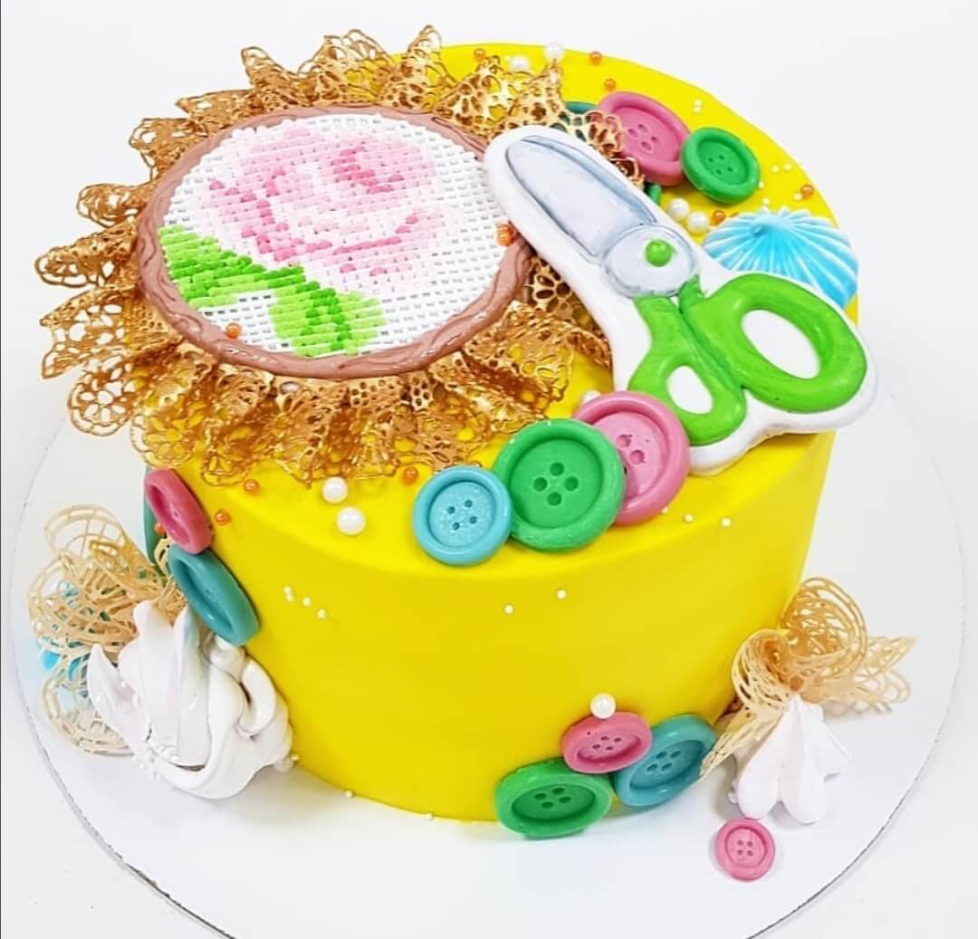 Рукодельницы, умницы и красавицы определенно оценят поздравительный тортик, связанный с их любимыми хобби